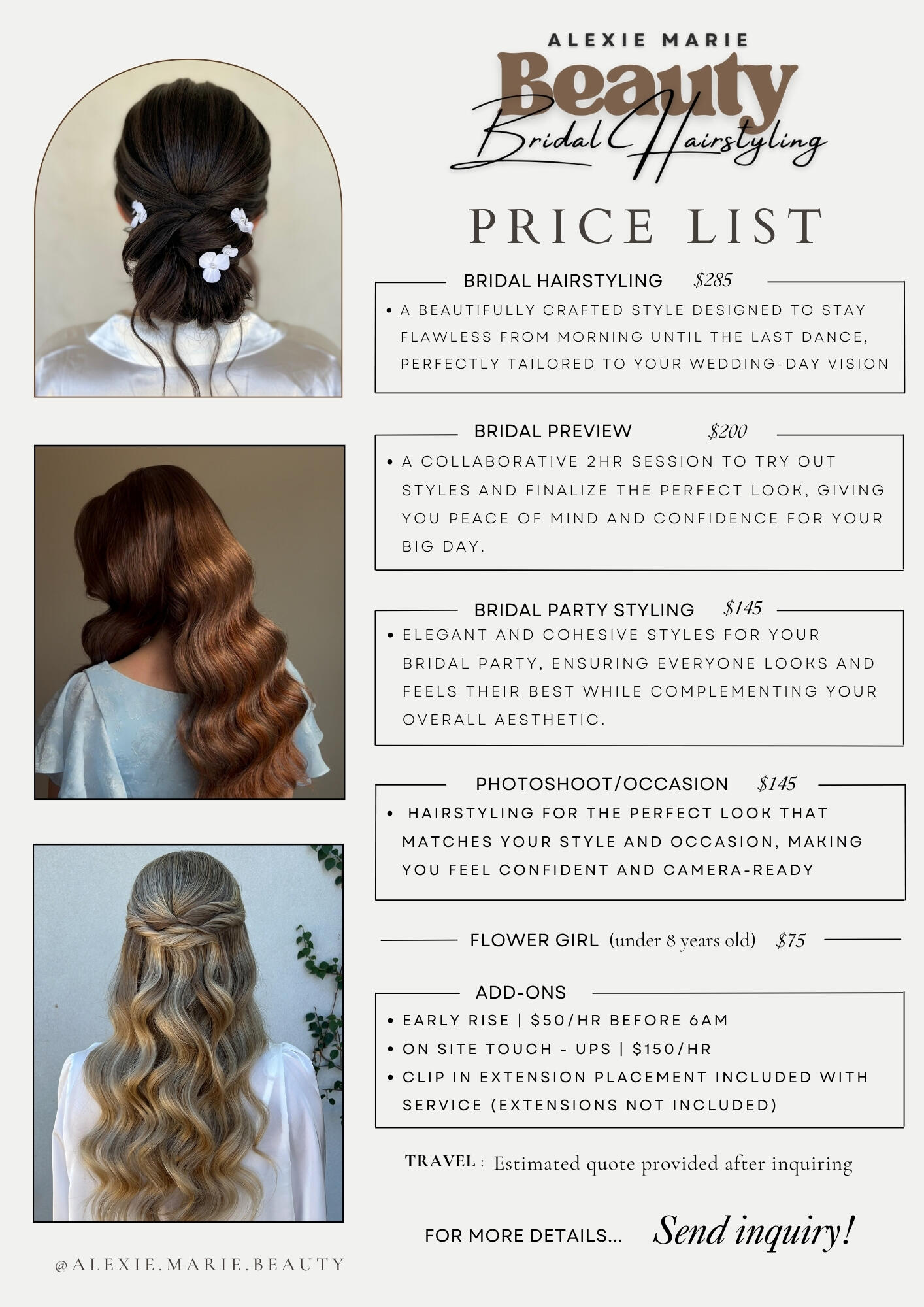 Hello! I'm Alexie, a dedicated bridal hairstylist, specializing in the art of crafting stunning hairstyles for Luxury Bridal and Special Occasions. Operating in both Arizona and California, I am thrilled at the opportunity to be apart of your special day, ensuring that you walk down the aisle with the hair you've always envisioned.