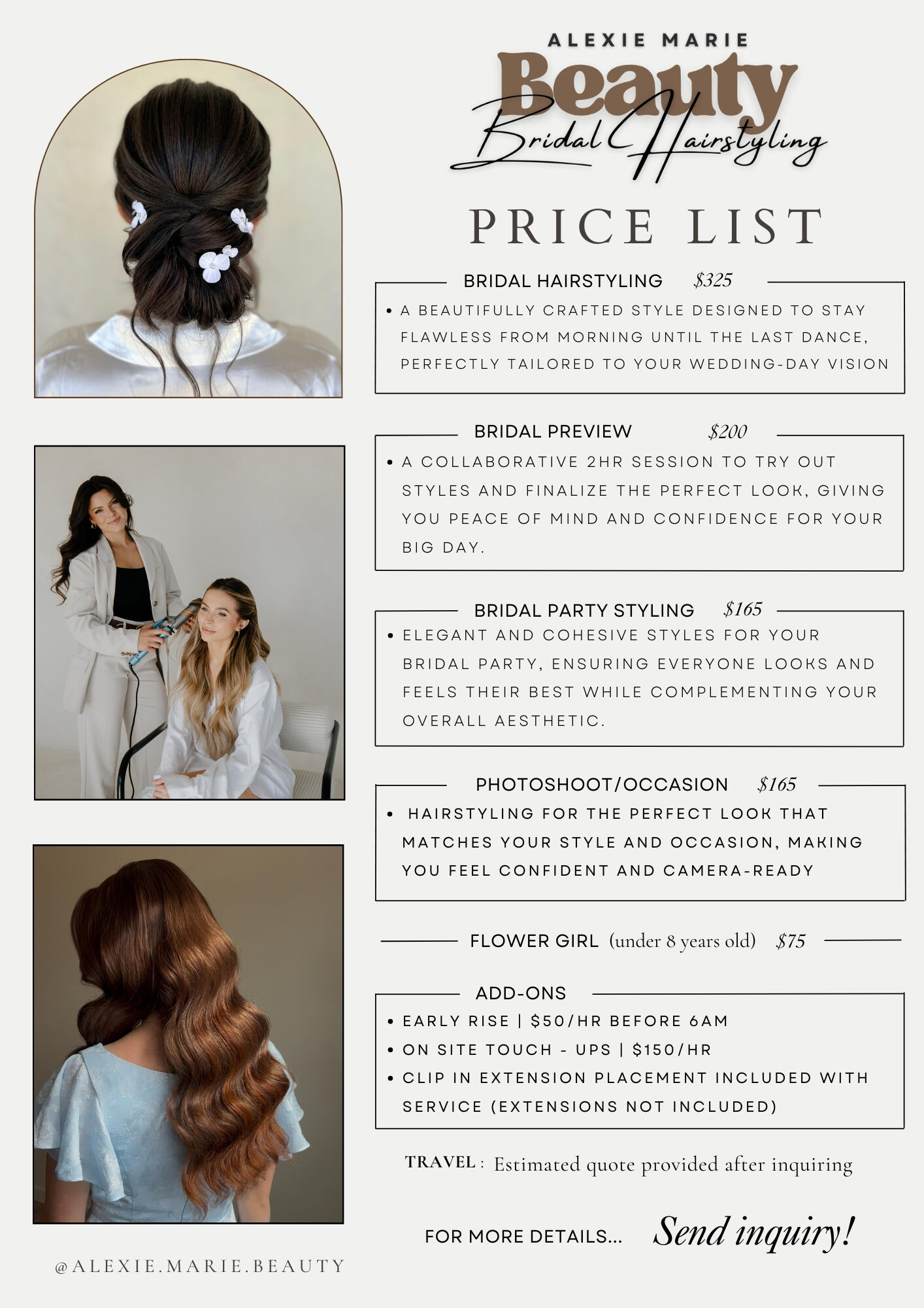 Hello! I'm Alexie, a dedicated bridal hairstylist, specializing in the art of crafting stunning hairstyles for Luxury Bridal and Special Occasions. Operating in both Arizona and California, I am thrilled at the opportunity to be apart of your special day, ensuring that you walk down the aisle with the hair you've always envisioned.